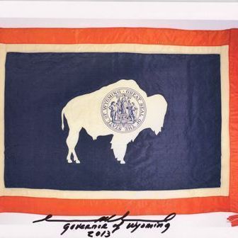 Color photograph of the hand-painted State of Wyoming flag in CCM's collection. Signed by Governor Matt Mead, dated 2013. Accompanied with a letter signed by the CCM board members and stamped "Recieved APR 22 2013 Governor's Office".Collection