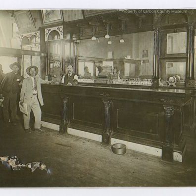 Photograph (copy): A black and white photograph of the Green Mill Bar, was in front of the old Depot in Rawlins. Large wooden bar with a mirror behind it. On the proper right side are three men standing in front of the bar, two are wearing hats. Behind the bar is the bartender (___ Lujan?) and next to him is a small child (Frank Lujan). In front of the bar is a spittoon. There is a tear on the proper right bottom side on the original.Collection