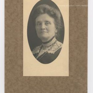 Black and white print. Studio portrait. Oval printed on tan paperboard. Mounted on matted brown paperboard. Head and shoulders portrait of a woman dressed in dark blouse/dress with light lace accents on shoulder, bodice front and high collar. She is wearing a double strand bead necklace and her hair is pinned up.