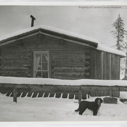 Update 2008: Black and white glossy reprint of Jack Ledbetter's home at Battle, 1902. Photo shows a side view of log cabin in winter with snow on the roof, on the fence railing and ground .A border collie dog is in foreground facing the camera. There is a window in the cabin with a vase of flowers and a curtain showing through. A black crosspipe arises from the roof held at top with crosswires.