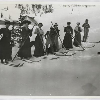 People skiing at Battle, 1905. Addie Smith, Ruby Bulb, Mrs. Haywood, Joe Ledbetter, Mrs. Jack Ledbetter, Frances Ledbetter, Mary Lodwick, ?.