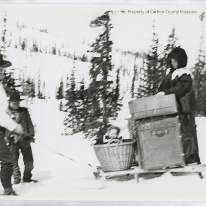 A lady with her luggage on a sled and a baby in a basket being pulled by two men at Battle, 1897.
