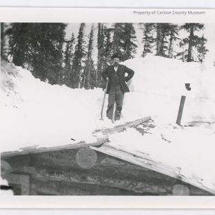 Update 2008: Black and white glossy reprint of a man dressed in dark colored pants, vest, bow type tie, jacket and hat standing on a snow covered roof of a log house with a wooden plank roof. A huge pile of snow is behind him with evergreen trees at the horizon. The man has his right arm propped on a shovel handle and his left is propped on his waist. A pipe chimney is on right in photo and appears to be partially snow covered at top center.
