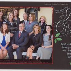Holiday greeting card from the Carbon County Attorney's Office to Carbon County Museum, card on one side, white on other with "Paid for by Cal Rerucha, Photograph by Corinne Miller" printed on back, printed on photo paper, front has a black background, with cartoon holly leaves and a red bow, in white font it reads, "We wish you a Merry Christmas and a Happy New Year! Best Wishes to you and yours May your Holidays be filled with happiness and peace, The Carbon County Attorney's Office, 2013", on the proper right side is a color photograph of two rows of people, the front row of people are sitting and the back row is standing, under the photograph in red and white font it reads, "Seated (Left to Right): Natalia Brown, Sarah Miles, Ava Bell, Cal Rerucha, Sherry Massey, Jaqueline Bowlus; Standing (Left to Right): Sarah Chavez, Ashely Mayfield, Windy Newbrough, Rae Jones, Michael K. Kelly, Dawnessa Snyder, Holly Law".Collection