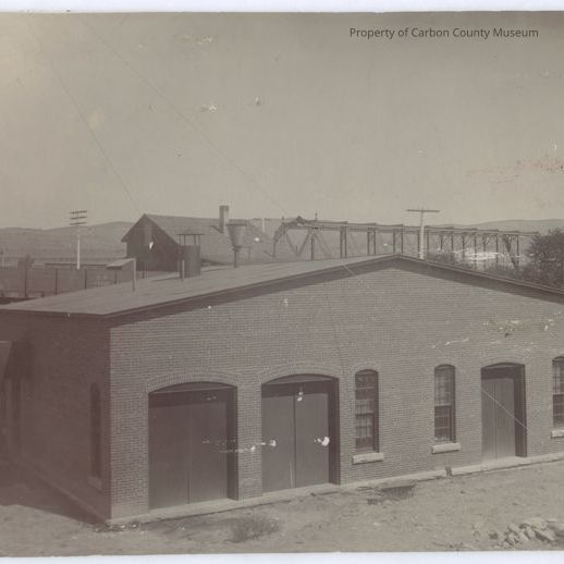 Sepia (?) print. Snapshot. Mounted on grey matboard. Image of a brick building with two wide double doors, one narrower double door and three tall narrow windows on long side front. Large smoke stack at left. Tressel bridge, second building and rail car in mid-ground. Hills in background.