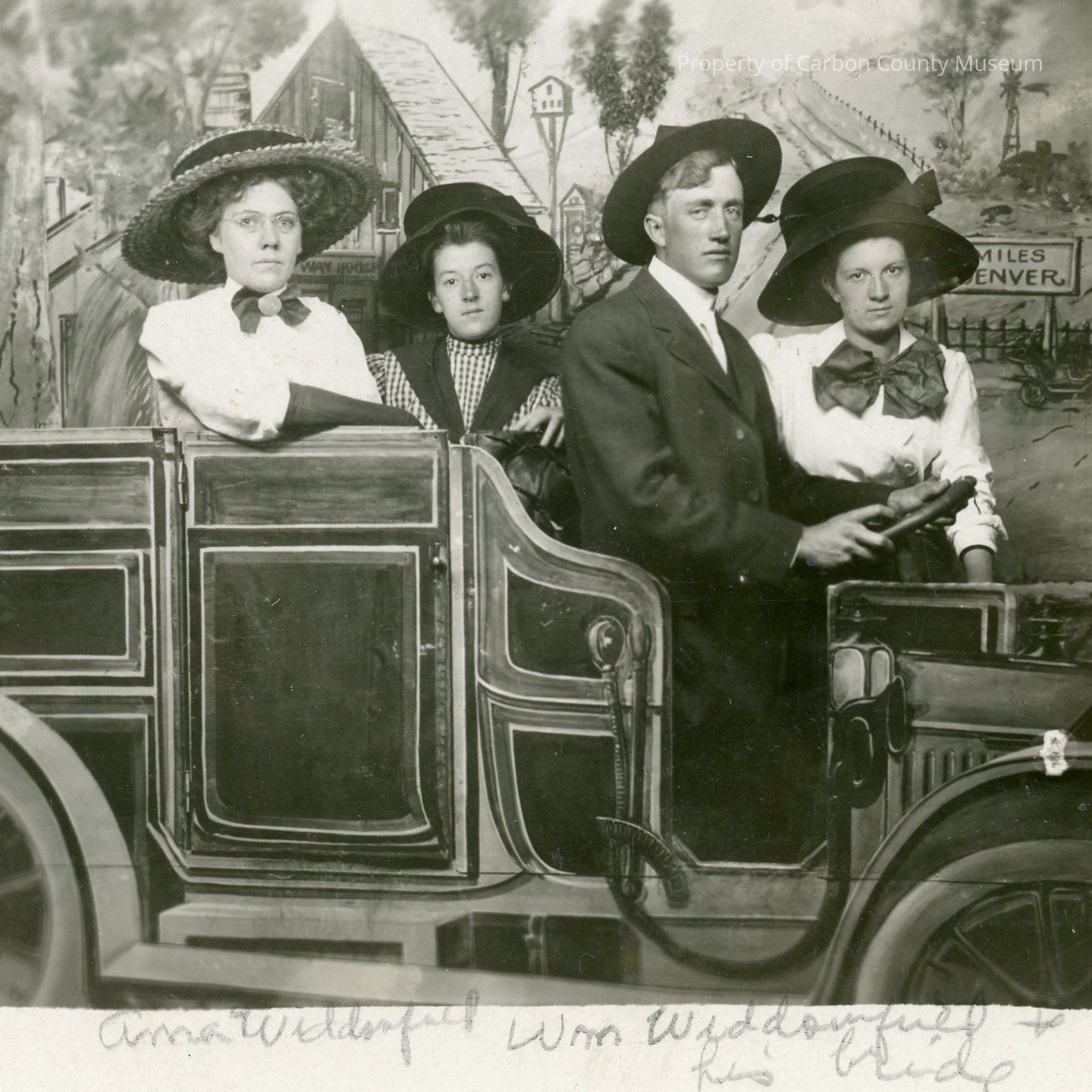 Update 2/2010: Black and white print. Studio portrait printed on postcard paper unused. Full length portrait of a man and three women posed sitting in a prop car in front of a painted scenery backdrop. Man is in the driver's seat with a woman beside him. Other two women are in the backseat. Man is wearing a dark suit and hat, women are in dresses and hats. Printed off set to right.