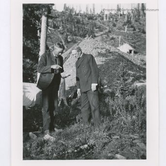 Update 2008: Black and white glossy reprint of two men, one wearing a two piece suit and tie, the other is wearing a double breasted suit, bow tie and eyeglasses. The men are standing in the left foreground examining a chunk of rock. A slag pile is behind them. A wooden building is at far right of print. The background consists of felled timbers lying throughout the hillside and road up the hill through the trees.