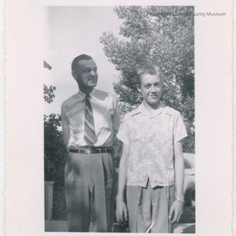 Four snap shot photographs, three are black and white, one is faded color, (A) the smaller (3.25"x4.25") black and white one is a photograph of a man and a teenage boy (?), the man has a tie and the boy is wearing a button down t-shirt and a watch, on the back it reads, "Albert and Carl 1950" (Albert and Carl Pedersen), (B) is 5"x3.75", black and white, photograph of a man and a woman standing in a house next to a table with flowers and cake, the man is wearing a tie and the woman is wearing a floral dress, on the back it reads "Mr and Mrs. C.B. Jensen on their 60th wedding anniversary, April 25th, 1956", (C) is 5"x4", three women in floral dresses standing in front of a window, the woman on the proper right is handing something to the woman on the proper left, on the proper bottom left corner it reads "Skinner", on the back it reads "Danish Sisterhood 50yr Anniversary, Maren Jensen, presenting 50 yr pins o Mrs. Pete Hansen, Mrs. Mary Nielsen, 1952", (D) is 5"x3.5", faded color photograph a large group of people sitting around a table with candles and food laid out, on the back of the photograph it reads "September 15 -54, Peter Sinidbecks(?) 80th Birthday Party".Collection