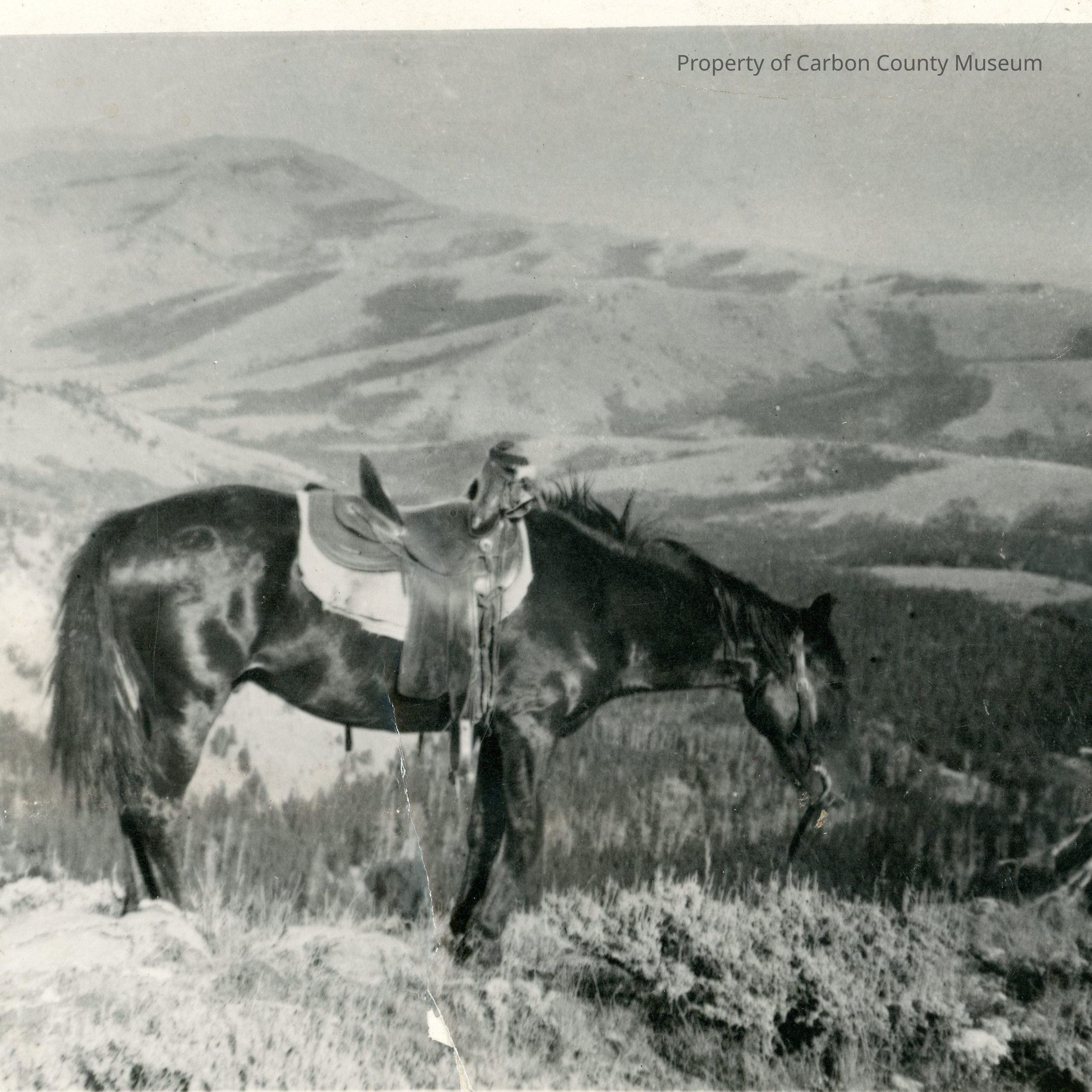 Black and white print. Snapshot. Image of a saddled dark horse standing on a high ridge of sagebrush and rock. Twisted dead tree at right. Rolling partially forested hills in valley behind ridge rising to sparsely forested peak in the background.