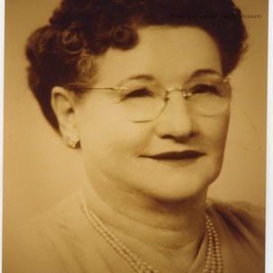 A black and white scanned print of Deliah Little, mother-in-law of C. T. Holman. Studio portrait of a woman with dark, short hair, dark eyes, wearing eyeglasses, three strand pearl necklace, light colored blouse.Collection