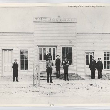 Written on bottom border in pencil: "1879". Written on back in pencil:"Rawlins, Wy home of Carbon County Journal weekly newspaper started in 1879. The building stood on 4th St. between Front and Cedar. John Friend is second from the eight and editor. Condition good.Collection