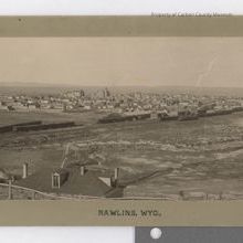 Black and white print on tan mat of birds eye view of Rawlins. In foreground is roof of Judge Merrell's house. Railroad tracks and yards in photo center with bulk of town laying North of tracks. Old Court House, Catholic Church and Old Wyoming State Penitentiary can be seen. Engraved in bottom left in brown ink: "E. Weyle Photo, S.F. Cal. Rawlins, WYO."