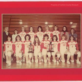 E- color photograph, taken out of matte, but still has tape on back, 8 RHS female basketball players standing in a line in a gymnasium, back of the photograph reads "1st WY State Games, Basketball, 1986, Gold, Chantell Stroud, Chris Nolin, Tracey Baxter, Jennifer Dorrell, Heidi McMillen, Barb Shultz, Denise Neuman, and Miriam Michie", 7"x5"