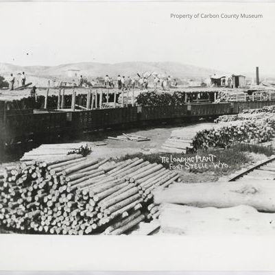 Update 5/2010: One black and white print and 3 copies of a tie drive. Foreground of image has piles of logs near railroad tracks. Center of photo has open rail cars and some have been filled with logs. Beyond is a platform with men working. A couple of small structures are on platform on photo right. Looking North in background are buildings. one is a square rock with 4 way roof to a pointed top, others are houses. Printed in white on original negative: "The Loading Plant Fort Steele, Wyo."