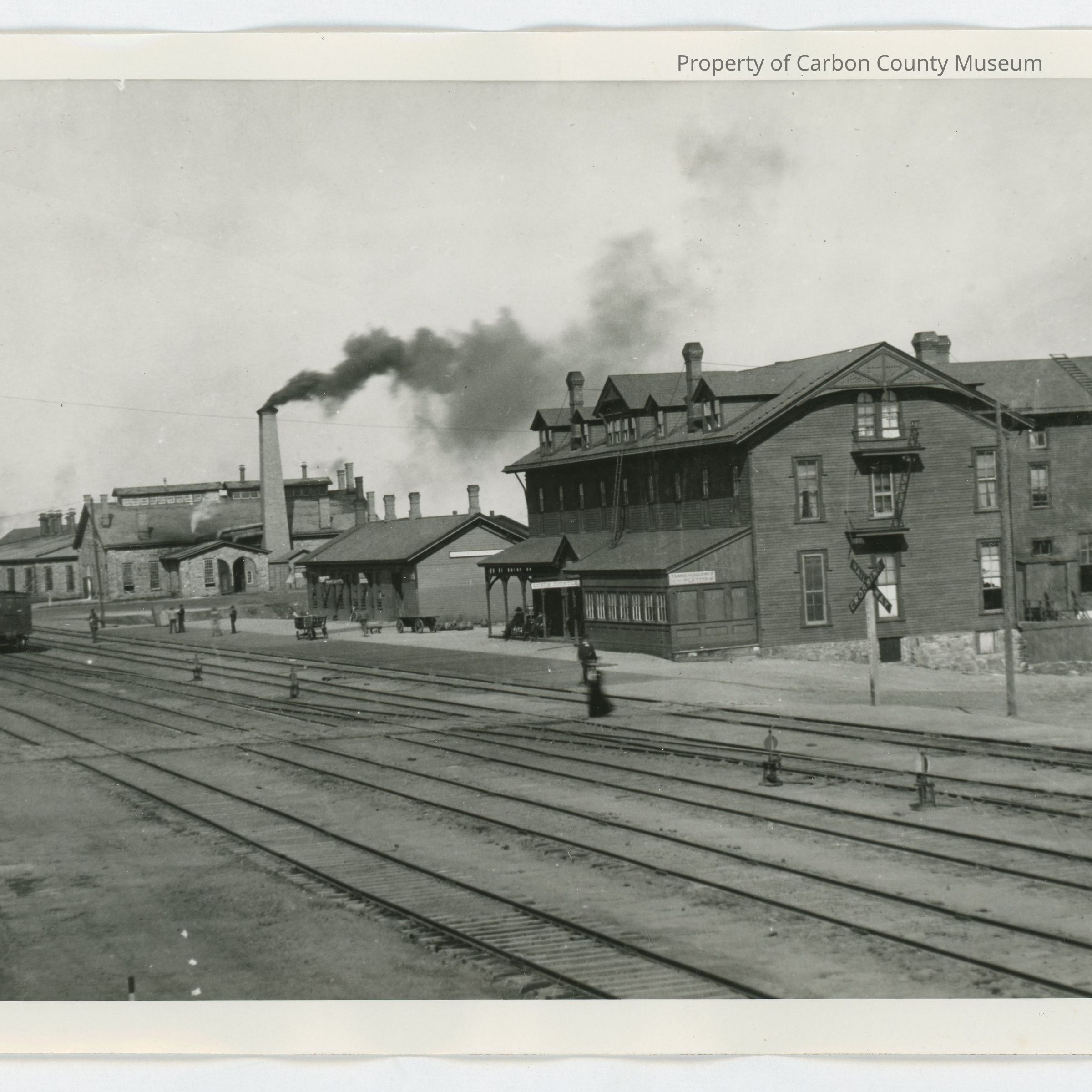 One copy, 8 x 10 black and white print. Written on back in pencil: "U.P. Hotel by railroad tracks-Southside original depot, roundhouse" "$11.00" Condition good. Scratched, bent, emulsion impacted.Collection