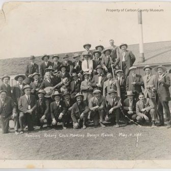 A- black and white photograph, a group of 36 men, they are outside in front of a building with two stacks coming out of the roof, at the bottom of the photograph it reads "Rawlins Rotary Club Meeting Daleys Ranch, May 5, 1925", 10"x8", on the back of the photograph is tape and a stamp reading "Lincoln Hi-Way Service, P.O. Box 206, Rawlins, Wyoming, 324-5211", above the stamp is an unknown signature, taken by Meyers Studio.