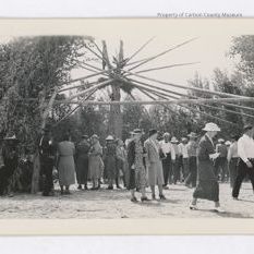 black and white photograph of a group of individuals standing around and under a large wooden object, the photograph appears to be from the 1950s or 1960s.Collection
