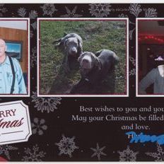 A 4" x 7 7/8" color photographic Christmas card is composed of three separate 2.25" x 2" snapshotsof Hans and Martin Pedersen, two puppies, and Hans and KeAnne Langford in a linear line at the top. Christmas "best wishes" is at side left with "Merry Christmas 2013" in a small box at left. Hans signed his names in blue ink and KeAnne signed her name in pink ink.Collection