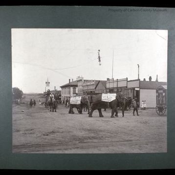 Black and white print on green mat. Image of a circus parade on Cedar street. On photo right is the back of a circus wagon. It is ornately decorated and has a barred opening near top. Two elephants follow with advertising banner draped over their backs. A man walks in front of the first elephant. Following elephants is a man leading a camel which a clown is sitting. Behind camels is another box wagon with open top on which two men sit. Following are a group of children and 3 men on horseback. in the distance the steeple of the Presbyterian Church is seen. A sign reading "Post Office" is on a white two story clapboard building. Next to that are two ornately decorated false front buildings (one is Range Cafe, and the other Smith Hopka Clothing Store). The next two buildings have signs "Goods bought" & "Millinery" (Mrs. Brown owned this). People are on the boardwalk in front of the buildings. A man on a bicycle with a small child in front of him are on the corner where parade is turning. There are also 2 young girls in light colored dresses and a young boy in a dark suit. Photo left is the Masonic Building at the southwest corner of 4th and Cedar