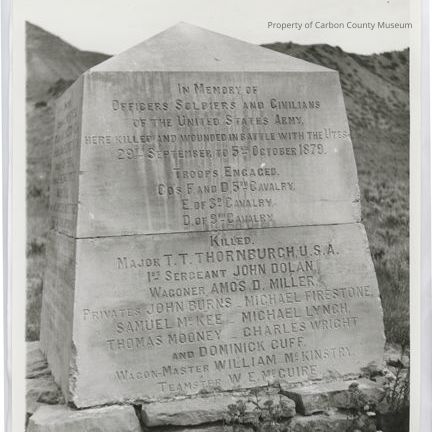 Update 5/2010: Black and white glossy print of concrete marker. Marker has sides that slope in toward top and top edges slope upward to a point. Engraved on side of marker: "In Memory of Officers and Civilians of the United States Army. Here killed and wounded in battle with the Utes. 29th September to 5th October 1879. Troops Engaged Co's. F. and D. 5th Cavalry, E of 3 D Cavalry, D of 9th Cavalry. Killed Major T.T. Thornburgh, U.S. A. 1st Sergent John Dolan. Wagoner Amos D. Miller. Privates John Burnes-Michael Firestone, Samuel McKee-Michael Lynch, Thomas Mooney-Charles Wright and Dominick Cuff. Wagon Master William McKinstry. Teamster W.E. McGuire".