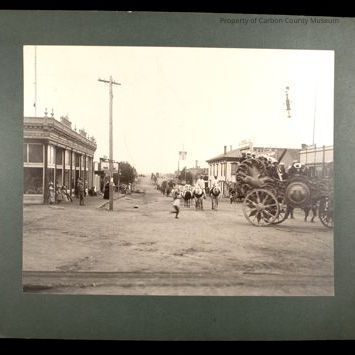 Black and white print on green mat. Image of circus parade on Cedar street. Turning corner on photo right is a large open wood carved wagon. There is a flying horse with carvings surrounding him and on wagon center is a portrait of two people with carvings continuing to front of wagon. The wheels are wood spoke with a triangular insert between each spoke. Wagon is loaded with men playing musical horns. They are followed by a group of horseback riders and more wagons . In distance is steeple of Presbyterian Church. A two story clapboard building with sign: "Post Office" is on photo right. A clock on top of a wood platform can be seen along street . On photo right is a two story building with a decorative parapet on top edge of roof. People are standing on boardwalks watching. "John A. Donnel" business sign on photo right. It has a picture of a cowboy on his horse roping a steer. A boy is running across the street in photo center. A street light hangs above street.