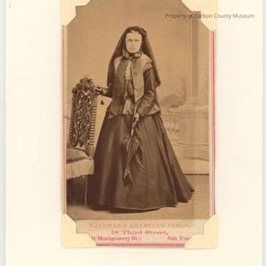 2 3/8" wide X 3 7/8" tall sepia full body photograph of Mary Elvinia Rail Osbone with her right hand resting on the back of a chair and left hand holding a small closed parisol. She is wearing a full length dress, and a veil with a very large bow under her neck, the ribbons of which reach below her waist. Photo has a small red outline, and the bottom 3/8" have the name and address of the photography company - Vaughan's Enameled Cards, 18 Third Street (511) Montcomgery St.) San Francis