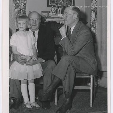 Black and white print of two seated men and a young girl standing. Girl is wearing a white taffeta dress with white knee socks and brown oxford shoes. Man on photo left has his arms around the waist of girl. Other man is looking toward young girl, his arm resting on his leg with hand under his chin. Both men are wearing suits.