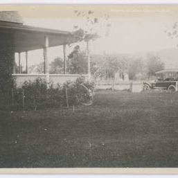 Black and white print of residence with vintage auto parked on street in front. House has covered porch with decorative posts and slat railing . Lawn and bushes surround the porch. A fence is between lawn and street. Other homes can be seen in the distance. House is on corner of 6th and Buffalo.. Condition good. Faded, edges curled.Collection
