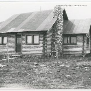 A black and white snapshot of a long cabin type house composed of two parts. There is a tall rock chimney at side left. House has a pitched roof with a flat tar paper? covering. A wire fence surronds the yard, with a wooden box at side left and a tire leaning against the lower part of the chimney. A door and four (2 double) windows are seen at the side left part of the house with a double window at side right. Yard is rocky and barren. Photo was in the master copy of the inhouse publication "Tullis." Believed to be the Lawrence Larsen house at Tullis.Collection