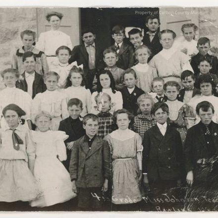 Update - January 2010: Black & white print of a large group of young school students standing in five rows on the steps of a sandstone building. The double doors in background are open. A teacher is at top row on left. Written in white from negative process: 4th grade Miss Johnson Teacher Rawlins, Wyo. On a separate white sheet the children are identified as: