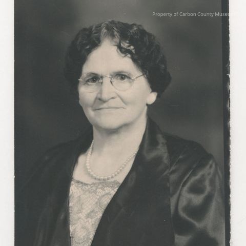 Update 2009: Black and white photo. Older lady wearing dark shiny suit jacket with lace blouse, pearl necklace. She wears glasses, hair in waves on sides and pulled up in back. Original photo, studio portrait.