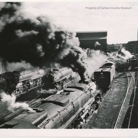 Black and white print of birds eye view of a railroad yard. Smoke and steam is rising from several steam engines setting on a series of four tracks. On photo right is some equipment and a man standing on an open car loaded with a rock looking cargo. Tall buildings are on photo right and a canopy structure is over tracks in center. On the back of one engine is "UP 3958".