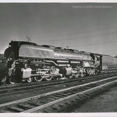 Black and white print of a steam engine. The number on the front of the engine is "3976". On the panel under engineers window is "3976" an don car behind engine is "Union Pacific". A man is leaning out the window of engineers section. Typed on back in blue ink: "Union Pacific Railroad Company's #3976. 4-6-6-4 Challenger Class Steam Locomotive. Freight and passenger service. First type built in 1936". Stamped in black: "68-276".