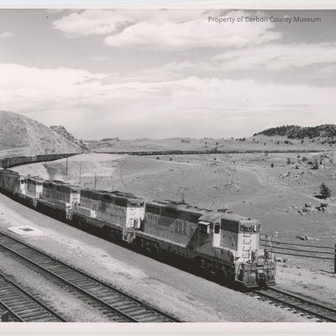 Black and white print of aerial view of train going around a curve. Four engines pull many cars, the end is not seen as the cars continue until out of sight behind a hill. the number: "X193" is on the engine. Two more tracks are in the foreground. On photo left is a hill with rock outcroppings and beyond is a highway. On photo right is an open rocky area with a few evergreen trees. Beyond is a hill with evergreen trees and bushes.