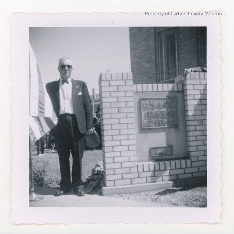 Written on back: [black ink] "Alex Gordon at City Hall" [pencil] "Plaque dedication of the Rawlins Spring[sic], and the City Hall."