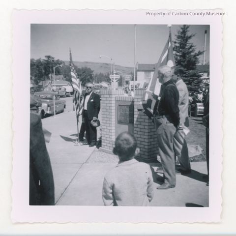 Written on back: [black ink] "Alex Gordon - holding the flag" [pencil] "Plaque dedication at the Rawlins Spring[sic], at the City Hall"