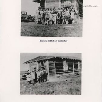 A page with two black and white snapshots attached by tape? from the in house booklet "Brown's Hill Dry Farmers, Last of the Homesteaders." Photo at top of page is a group photo of a man and woman at side left with two rows of children of all ages standing to side of a wooden buildingwith two vintage autos at side left. Straw? strewn yard is at foreground. Typed beneath photo: "Brown's Hill School picnic 1931."