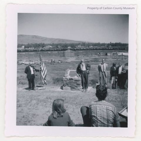Written on back: [black ink] "Alex Gordon - Holding the flag" [pencil] "Plaque dedication of the Rawlins Spring[sic], and City Hall."