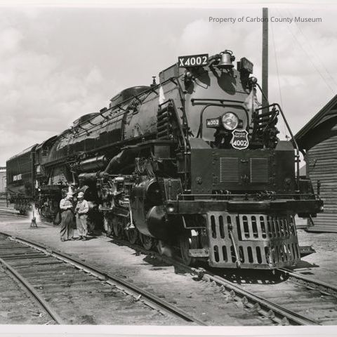 Black and white print of steam locomotive # X4002. Inside railroad logo shield on front is written: "Union Pacific 4002". Beside headlight and on top beside bell are plates on which are written: "X4002". Two men stand on ground beside the engine. Steam is coming from under train behind the engine an din front of a car on which is written: "Union Pacific". A dark clapboard building is on photo right. Typed on back in blue ink: "Union Pacific Railroad Company's Simp-Art. "Big Boy" Freight steam Locomotive. First of type built in 1941. 68-172."Collection