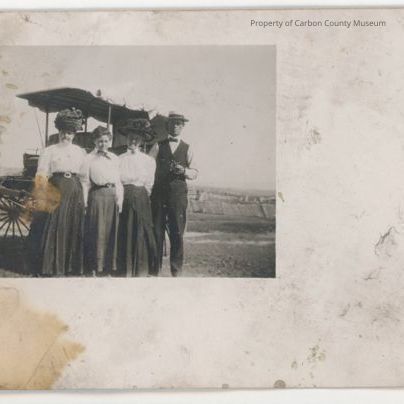 Update 2/2010: A black and white image on side left of an unused postcard front. Print shows 3 women dressed vintage clothing and one man standing to side front of wagon with opened sides and roof with a side canvas rolled up and secured, hitched to a horse.