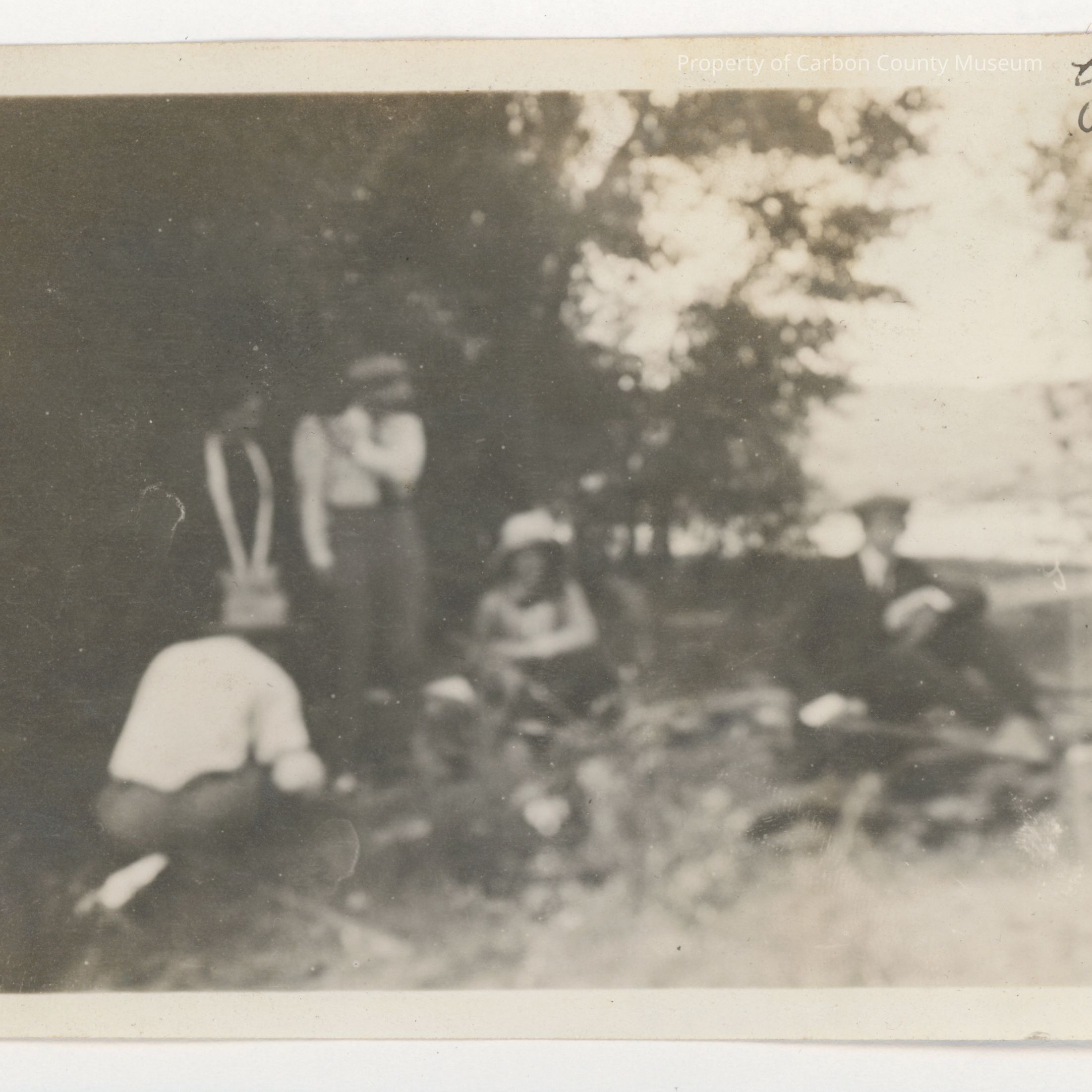 Print 7: Image shows a group of men and women sitting on barren ground having a picnic. Dormant grass is in foreground and trees are at side left and center right . Image is blurry and unable to determine number of men and women. Written in black ink at top edge: "Eating dinner Platte River '12 [1912] Bob, John, Nelle, Florence, Christel." Fair condition. Print edges are soiled and yellowed. Side right has light opaque area. Corners are worn, and there is a large black paper remnant attached to back.