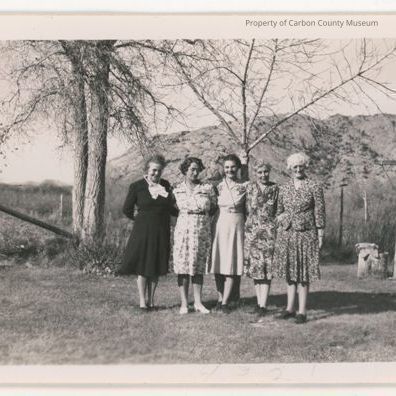 Written on back in pencil: "Edna Hayworth, Florence Alcorn Lamb, Christel Thode, Nell Lynch Sunn, Josie Baires Castellon, H.S. 1909 graduation class at Sun's Ranch in 1944." The #C18 is stamped side right in black ink.