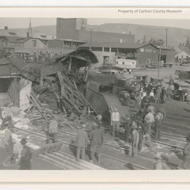 Update 4/2010: Black and white print. Snapshot. Image from elevation of the aftermath of a train wreck. Crushed box car on its side with contents strewn about the left . Destroyed engines at center. Vintage automobiles and curious folds at right. Lumber company and town in background. Workmen and other people in foreground.