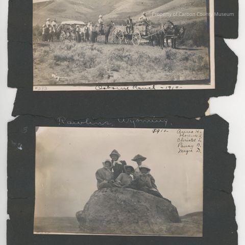 Lower print on page shows 5 women with wide brim hats sitting on top of a huge boulder. They are wearing vintage clothing and wide brimmed hats with scarves over them. Desolate country is in background. Written on front of print at top right in black ink: "1910. Anna H. Florence A. Christel T. pansy B. Mazie D. " Written in white ink at the middle of the black page: " Rawlins, Wyo." Fair condition with dark discoloration at many locations. There are black scuff marks and tiny scratches. Measures 3 1/2 x 5 1/8".Collection