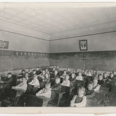 Black & white print of a classroom of young children seated at their wooden desks. The desks are in 5 rows & attached to each other. All the children have their hands clasped together on their desktops. A framed photo of George Washington hangs on the rear wall above blackboard.