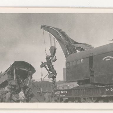 Update 4/2010: Black and white print. Snapshot. Image of the aftermath of a train wreck with a heavy duty crane removing debris from the wreckage pile. Workmen working on the pile in foreground left.