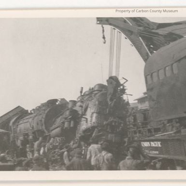 Update 4/2010: Black and white print. Snapshot. Image of the aftermath of a train wreck with a heavy duty crane working to remove the remains of one of the engines. Workmen in foreground center.