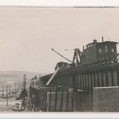 Written in blue ink on track: "Building the UPRR Bridge at Ft. Steele over the Platte River" "Sager Collection"
