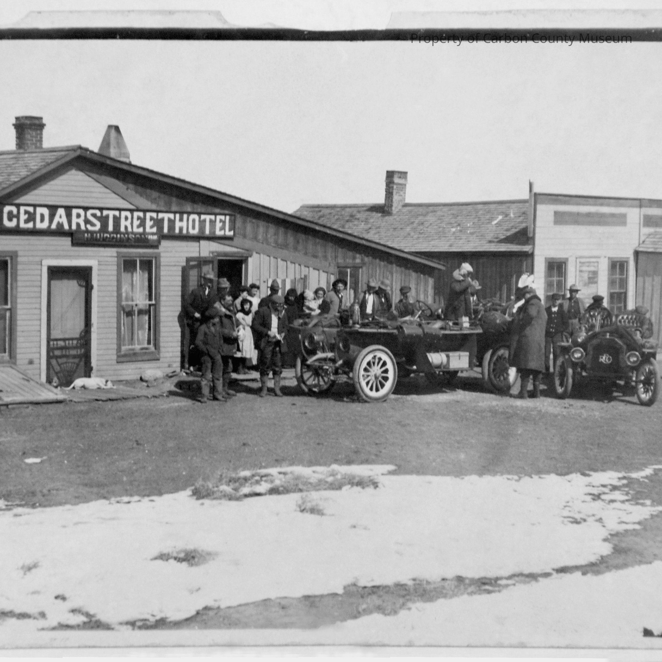 A scanned copy of a black and white photographic print. Image shows two vintage automobiles parked on a dirt street in front of wooden buildings with a group of people standing around and looking at the vehicles. A wooden building on left has a large sign at top front of building: Cedarstreet Hotel. Other structures to side right are not identified. Patches of snow are seen on the road bed in the foreground. Note: This is a photo of the Cedar Street Hotel in Medicine Bow, and the car on side left with the large running board and luggage on it is identified as the Thomas Flyer, and the car on the right is the REO pilot car. These cars were participating in the New York to Paris Auto Race of 1908. Good condition, newly scanned. Has grainy appearance.Collection