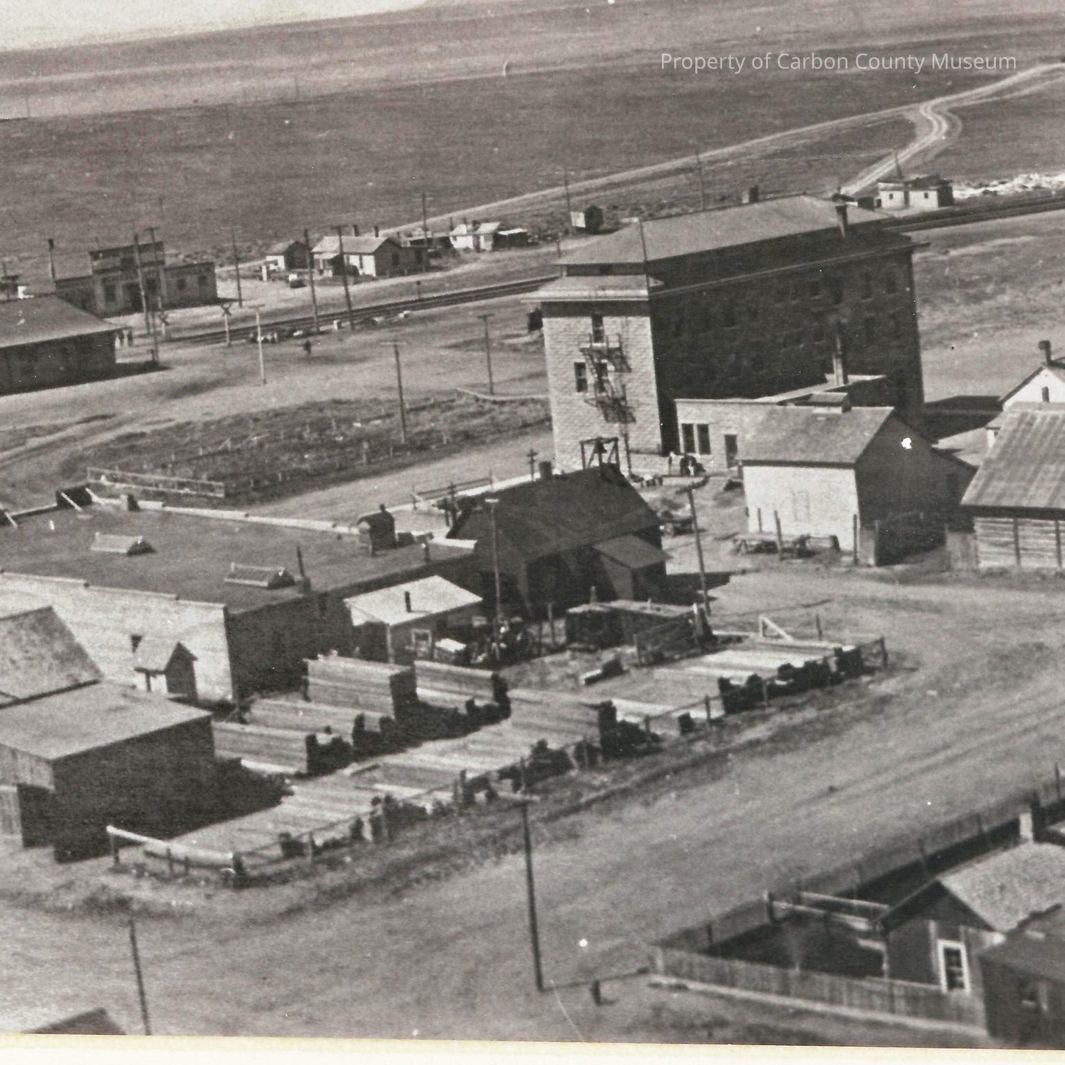 A black and white three piece panoramic view of Medicine Bow, 1919. Prints are mounted on a rectangular foam core 8" x 41 5/8." The three prints are mounted in linear fashion as a single view. The images are different shades with the center view being darker and the view on the right side being the lightest. Image depicts a early day townsite with multiple buildings, train depot at center left; dwellings, barns, outbuildings, pens, grainery?, water tower? railroad tracks in distance, dirt roads, and treeless land in town and in the surrounding area of the townsite. Side right has a small red x on a building. Written on lower right corner from developing process in white: Medicine Bow, WY May 1919, Dell Bros., Havre, Mont. Images are of good condition. They show the imperfections of the original image. with wrinkle line, black specks, and other defects. The foam core board is worn on all edges with abrasions, smudges, staining and indentions front and back sides.